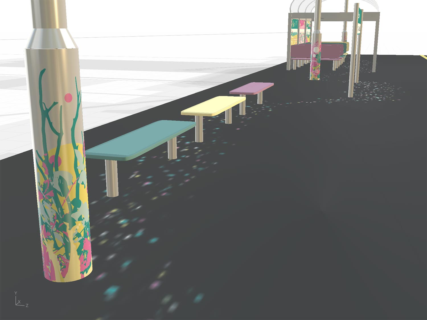 This project is a response to a Network Rail brief from the RSA Student Design Awards called a Platform for Joy. The brief set the question, “How might we unlock joy for people at train stations?”, using designer Ingrid Fetell Lee’s research on the “Aesthetics of Joy”. This design aimed to transform a small local station platform, using a pastel colour palette of turquoise, pink and yellow. Inspired by the train rides through British countryside, the seating on the platform evokes a train carriage, using booth benches under a domed pergola set against a wall of train windows. The windows use a semi-transparent vinyl print of different landscapes and sights, anchored by a bridge in the centre.